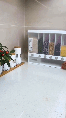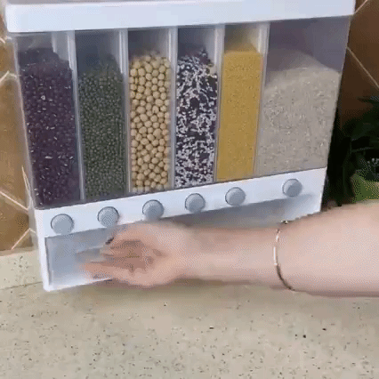 Con 6 compartimentos transparentes, este dispensador te permite elegir fácilmente tu cereal favorito, granos, legumbres o lo que quieras almacenar.